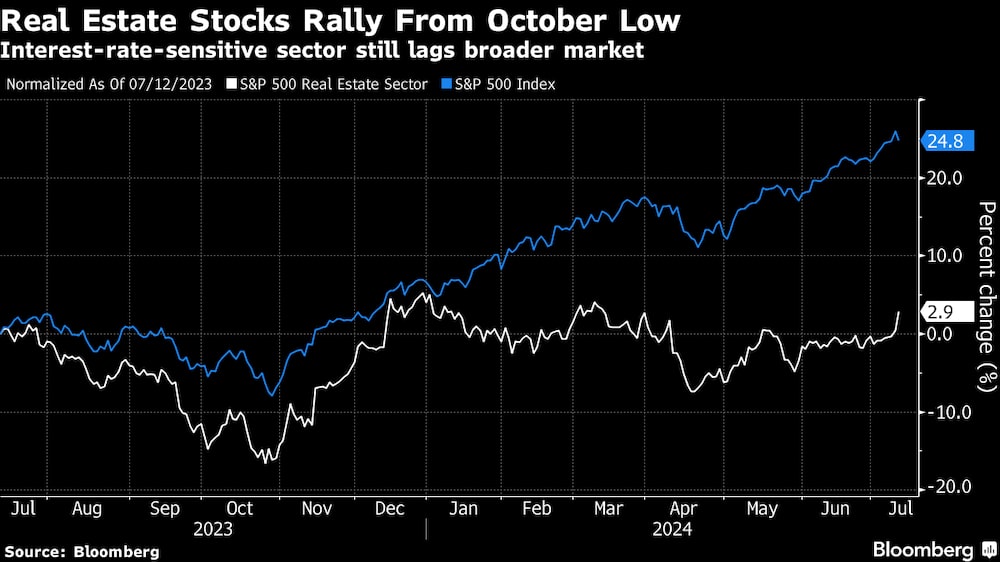Las acciones de las empresas inmobiliarias saltaron hasta un 2,7% este jueves para su mayor ganancia intradía de 2024, subiendo a su nivel más alto desde marzo, ya que los inversores se hicieron con valores de constructoras de viviendas, inmobiliarias digitales y comerciales por igual. El sector inmobiliario también es el grupo del índice S&P 500 que mejor se comportó este jueves, con un volumen que supera en cerca de un 30% la media de 30 días, según datos recopilados por Bloomberg.
