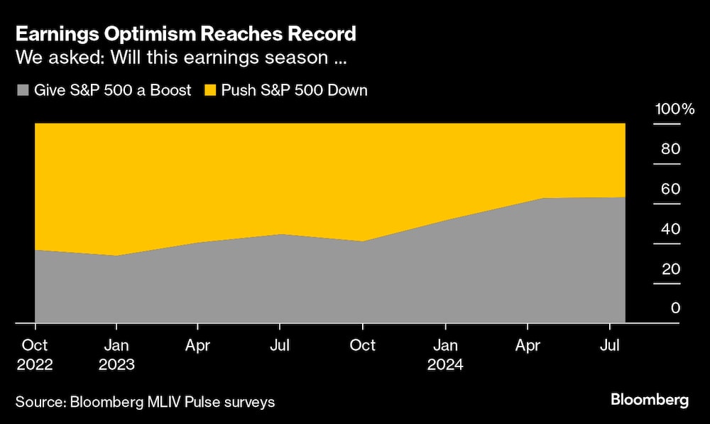 A medida que la temporada de presentación de informes se acelera, con resultados de cabezas de cartel como Tesla Inc. (TSLA) y Alphabet Inc. (GOOGL), matriz de Google, en la cubierta en los próximos días, casi dos tercios de los 463 encuestados en el cuestionario esperan que las ganancias impulsen el índice de referencia de renta variable estadounidense.