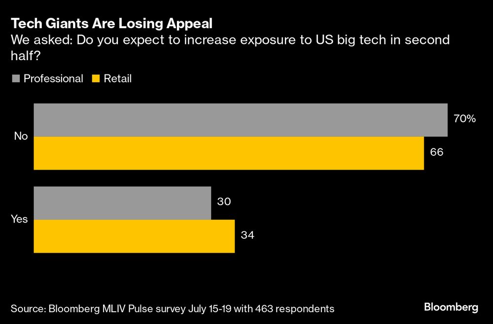 Las elevadas valoraciones, especialmente entre las acciones tecnológicas, también han preocupado a los inversores. Teniendo esto en cuenta, cerca del 70% de los encuestados afirman que no tienen previsto aumentar su exposición a las grandes tecnológicas estadounidenses en el segundo semestre del año.