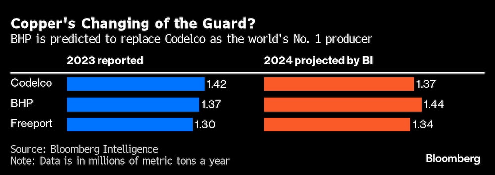 Codelco ha visto caer su producción en medio de interrupciones en las minas y largos retrasos en los proyectos, ya que juega a ponerse al día después de décadas de falta de inversión. Algunos analistas, incluidos los de Bloomberg Intelligence, ven a BHP Group superando a Codelco este año como el principal productor mundial de cobre.