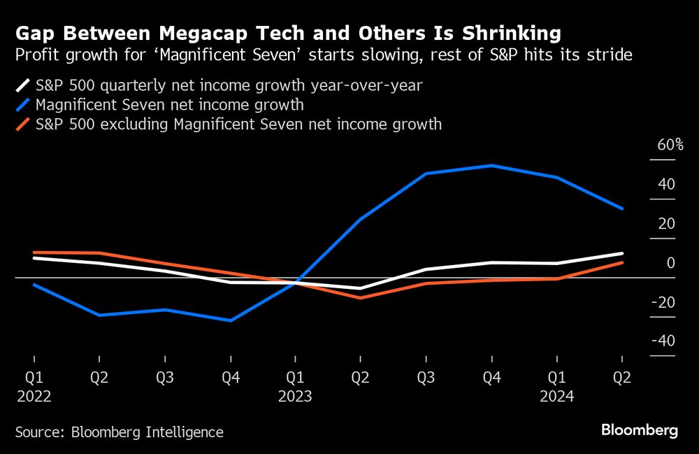 Las señales del cambio de tendencia son ineludibles. Durante varios trimestres, el crecimiento de los beneficios de las siete mayores empresas tecnológicas impulsaba las ganancias del índice S&P 500. Eso está a punto de cambiar, ya que el resto de los valores del índice de referencia, excluidos los llamados Siete Magníficos, están en camino de registrar su primer crecimiento de beneficios desde el cuarto trimestre de 2022, según muestran los datos recopilados por Bloomberg Intelligence.