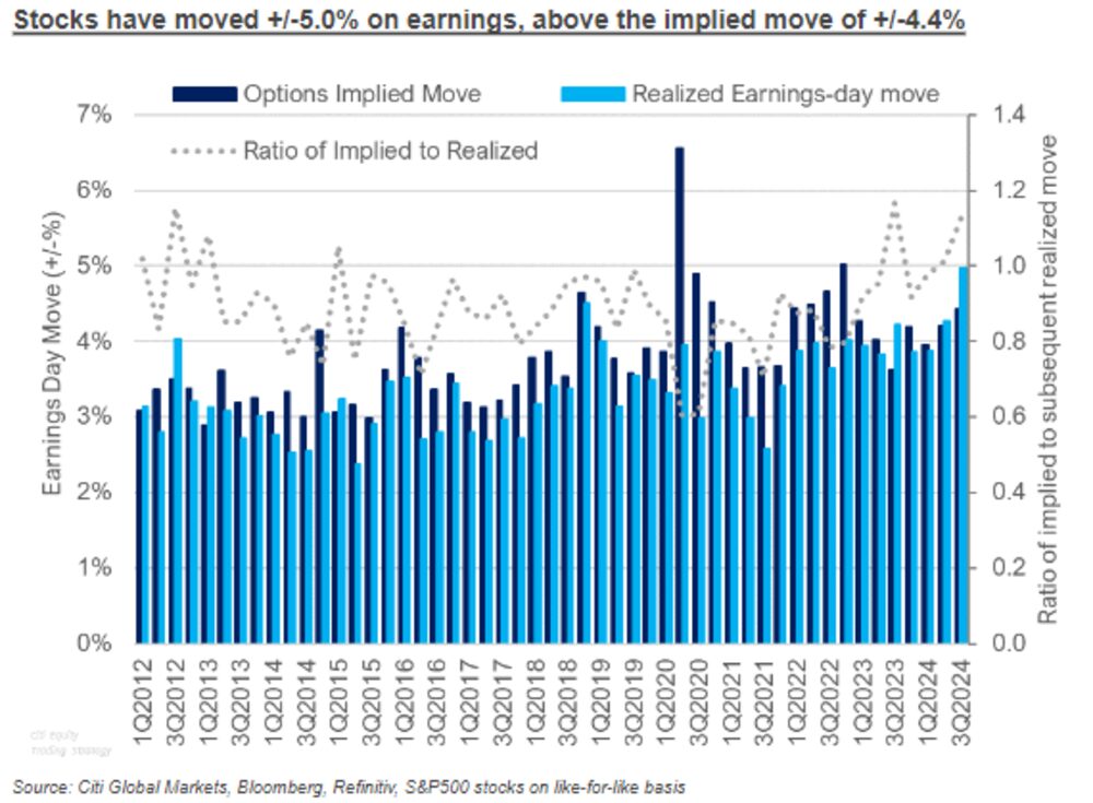 Los datos de Citi revelan que la empresa media del S&P 500 que publica beneficios del segundo trimestre se ha movido hasta ahora un 4,9% en cualquier dirección el día del anuncio. Eso está muy por encima de la media histórica del 3,3%. Además, los movimientos del día de los beneficios en una sola dirección -al alza o a la baja- fueron también los más amplios de los últimos 12 años, según muestran los datos.