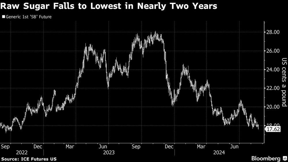 Bloomberg — El azúcar sin refinar cayó a su nivel más bajo en casi dos años debido a que el ritmo de trituración de la caña de azúcar en Brasil y una esperada recuperación de la producción en productores clave, como Tailandia y la India, impulsan las perspectivas de suministro.