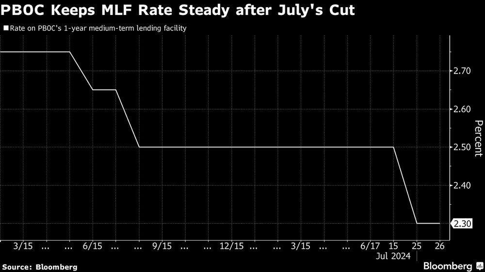 Bloomberg — El Banco Popular de China mantuvo la tasa de interés de sus préstamos a un año, o facilidad de préstamo a medio plazo, en el 2,3%, tras reducirlo en 20 puntos básicos en julio. Mientras tanto, el banco central retiró 101.000 millones de yuanes netos (US$14.000 millones) del sistema bancario este mes, ya que 401.000 millones de yuanes de los préstamos vencieron el 15 de agosto.