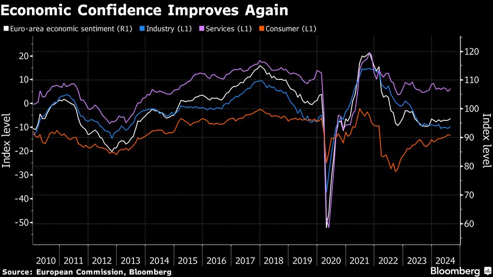Bloomberg — La confianza económica de la zona euro subió por segundo mes gracias a las mejoras en la industria y los servicios.
