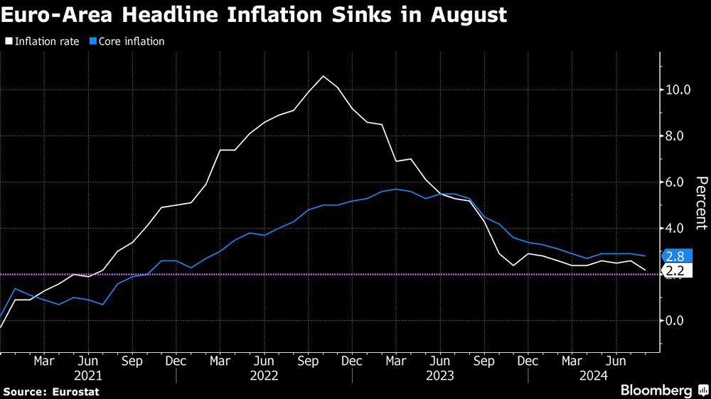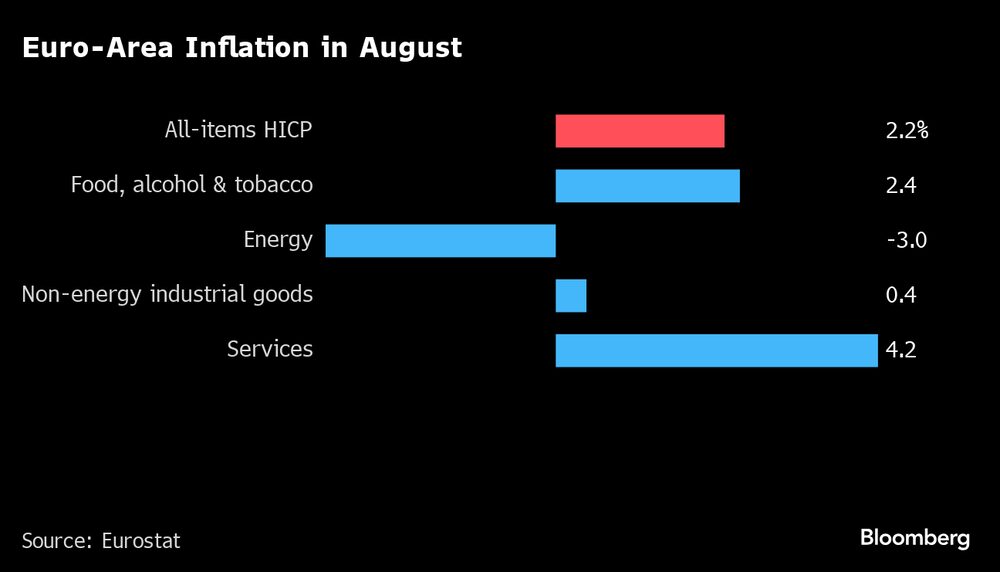 Los precios al consumo subieron un 2,2% respecto a hace un año en agosto, según informó Eurostat este viernes. Esta cifra fue significativamente inferior al 2,6% de julio e igualó la estimación media de los analistas en una encuesta de Bloomberg.