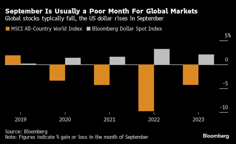Septiembre es históricamente un mes volátil para los mercados mundiales. Ha sido uno de los peores meses para las acciones en los últimos cuatro años, mientras que el dólar suele obtener mejores resultados, según datos recopilados por Bloomberg. El medidor del miedo de Wall Street -el índice de volatilidad Cboe, o VIX- ha subido cada septiembre de los últimos tres años, según muestran los datos.