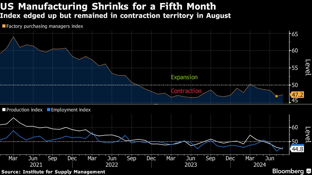 El descenso de los pedidos y el persistente retroceso de los pedidos pendientes siguen siendo vientos en contra de la producción e ilustran un sector manufacturero en dificultades. Aunque el indicador de empleo en las fábricas del Institute for Supply Management subió, siguió mostrando un tercer mes de contracción.