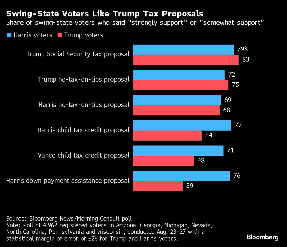 Las propuestas del expresidente Donald Trump de exenciones fiscales selectivas están resonando entre los votantes de los estados disputados, que aprueban por abrumadora mayoría sus ideas de eliminar los impuestos sobre los ingresos por propinas y las prestaciones de jubilación.