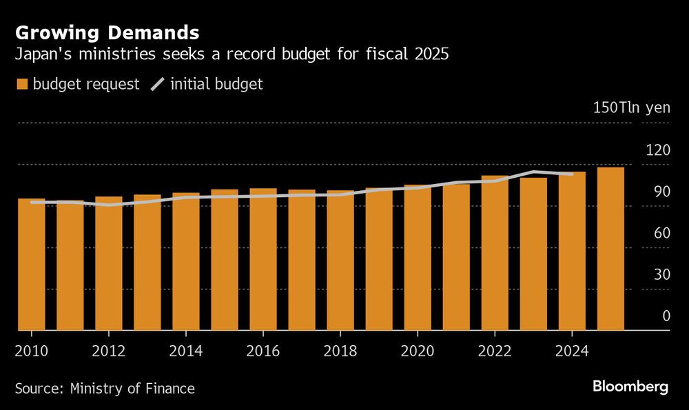 Los ministerios japoneses han batido un nuevo récord con sus solicitudes presupuestarias para el año que comienza en abril de 2025, mientras la nación lucha con la necesidad de aumentar el gasto en seguridad social y defensa al tiempo que mantiene bajo control su montaña de deuda.