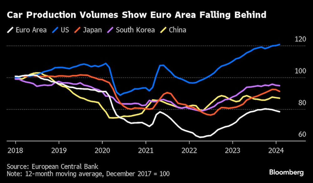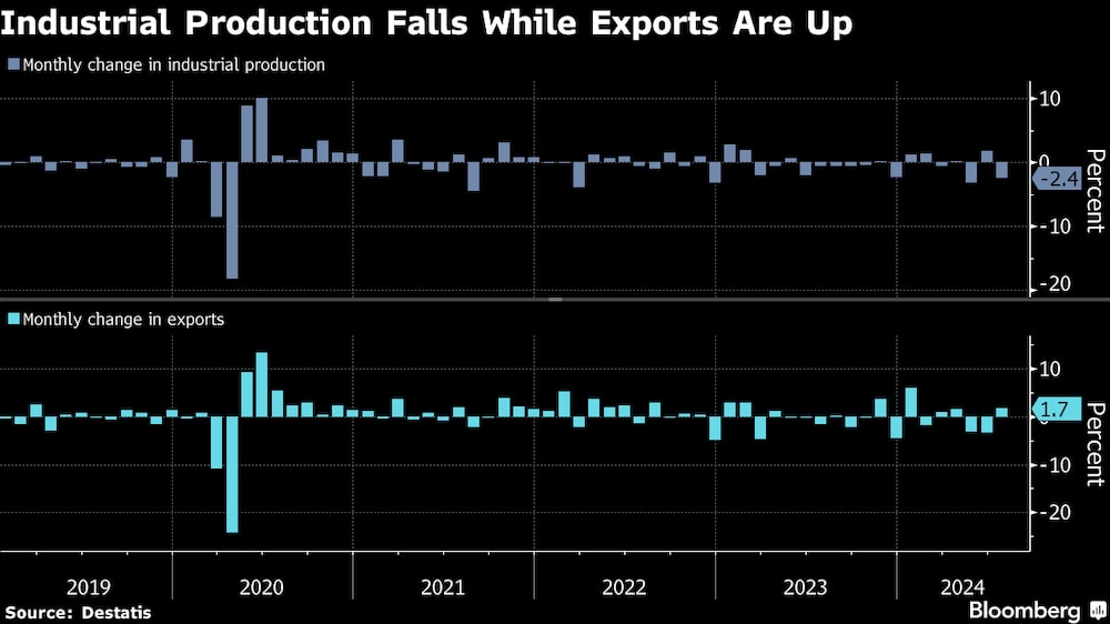 La producción industrial alemana cayó en julio, lo que pone de manifiesto los problemas subyacentes de la mayor economía europea tras su inesperada contracción del último trimestre. La producción disminuyó un 2,4% respecto a junio, peor que todas las estimaciones de una encuesta de Bloomberg entre economistas. La automoción fue el principal motor, aunque la mayoría de los sectores descendieron.