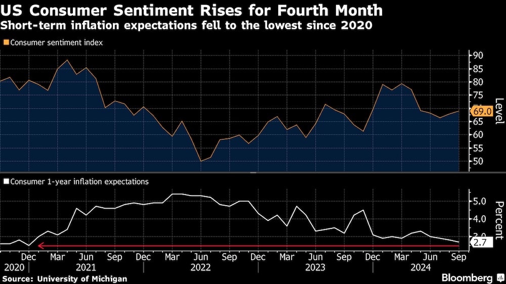 El índice de confianza aumentó a 69 desde los 67,9 de agosto, según mostraron el viernes las cifras preliminares de la Universidad de Michigan. La estimación media de una encuesta de Bloomberg entre economistas apuntaba a una lectura de 68,5.
