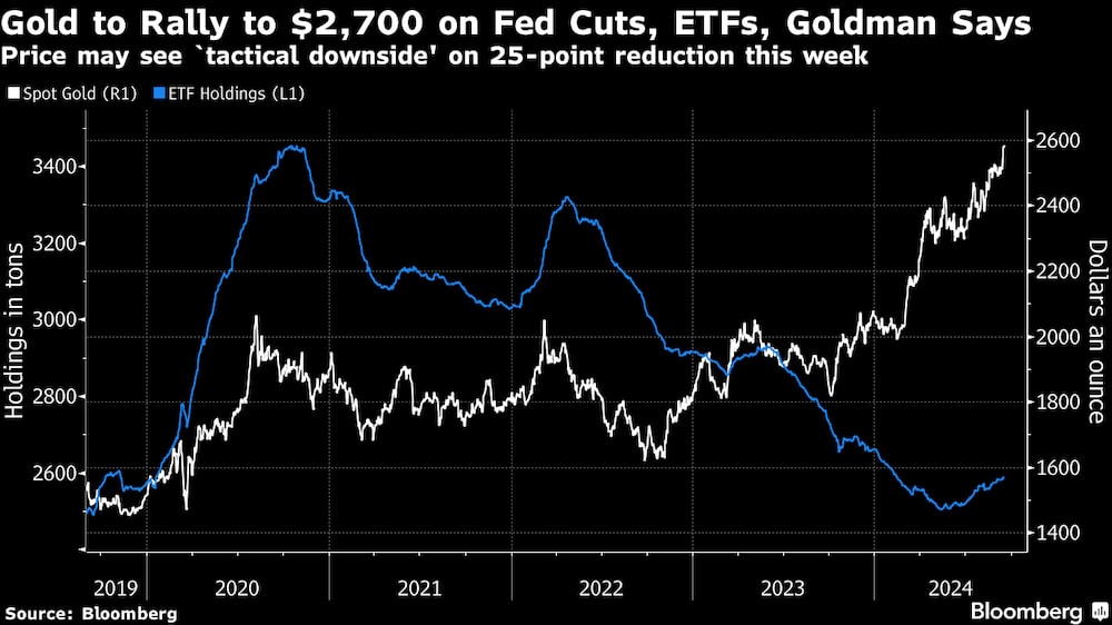 El metal precioso ha sido uno de los productos básicos de mayor rendimiento este año, con un aumento de alrededor de un cuarto y alcanzando sucesivos récords a medida que los bancos centrales aumentan las compras y los operadores miran hacia el giro de la Fed hacia la flexibilización monetaria. Los inversores siguen divididos sobre si el banco central estadounidense iniciará su ciclo de flexibilización esta semana con una reducción de medio punto o, como espera Goldman Sachs, un recorte más modesto de 25 puntos básicos.