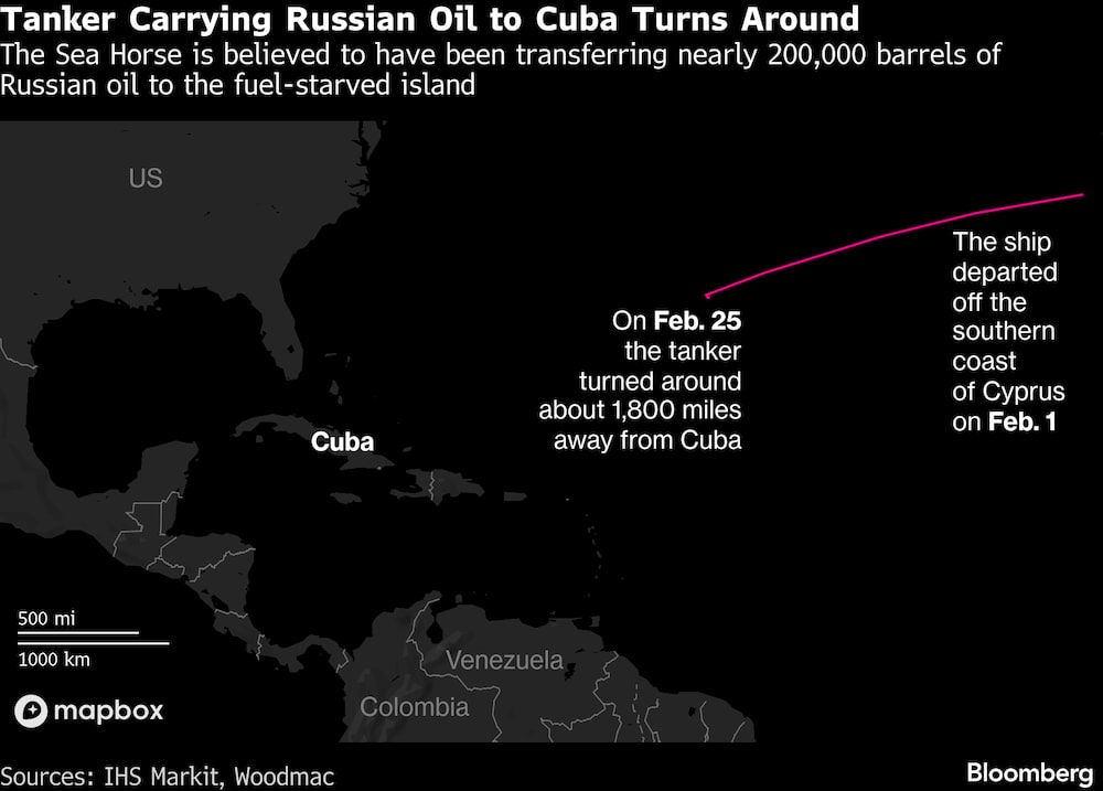 Bloomberg — Un petrolero que se cree transportaba petróleo ruso a Cuba, país con escasez de combustible, fue desviado, una medida que probablemente empeorará la escasez en la isla caribeña.