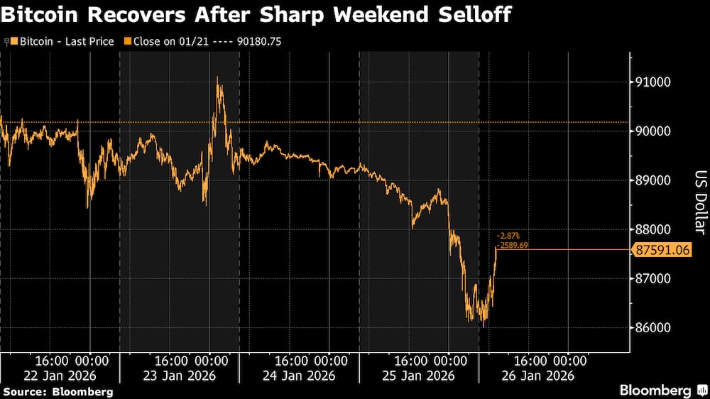 La mayor criptodivisa cayó hasta un 3,5% el domingo hasta un mínimo de 2026 justo por encima de los U$86.000, antes de subir hasta los US$87.733 el lunes por la mañana en Singapur. El segundo mayor token, el éter, se desplomó hasta un 5,7% antes de repuntar un 2% para cotizar a US$2.872, todavía cerca de su nivel más bajo desde mediados de diciembre.