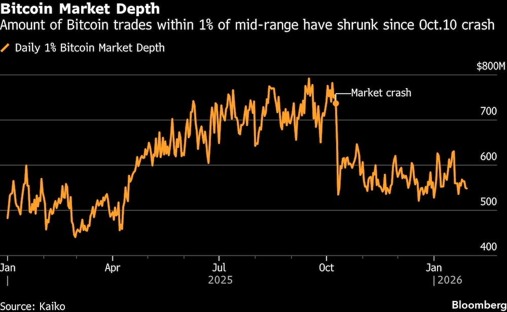 La profundidad de mercado de Bitcoin, una medida del capital disponible para absorber grandes operaciones, sigue estando más de un 30% por debajo de su máximo de octubre, según los datos de Kaiko. La última vez que la liquidez cayó tanto fue tras el colapso del FTX en 2022.