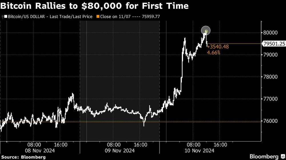 Bloomberg — El Bitcoin superó los US$80.000 por primera vez, impulsado por el apoyo del presidente electo Donald Trump a los activos digitales y la perspectiva de un Congreso con legisladores a favor de las criptomonedas.