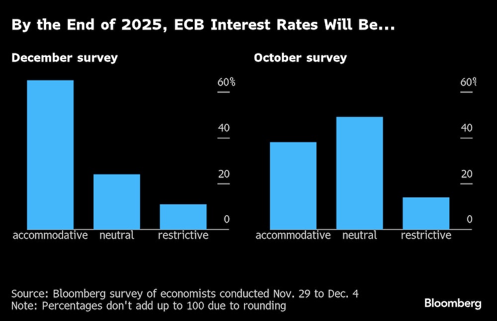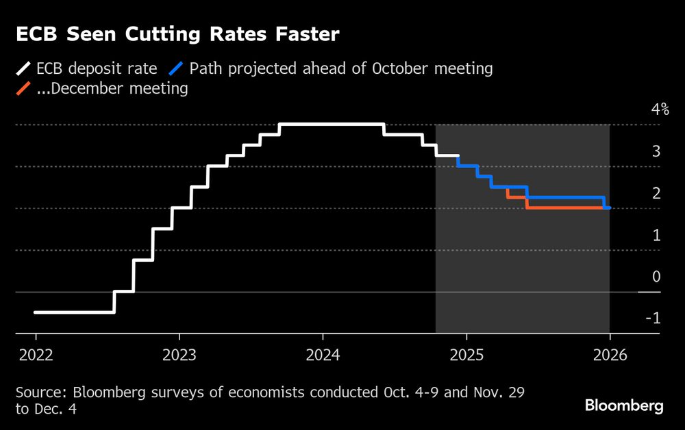 Bloomberg — Según una encuesta de Bloomberg, el Banco Central Europeo reducirá las tasas de interés más rápidamente de lo previsto para estimular una economía que se enfrenta a un crecimiento y una inflación más débiles.