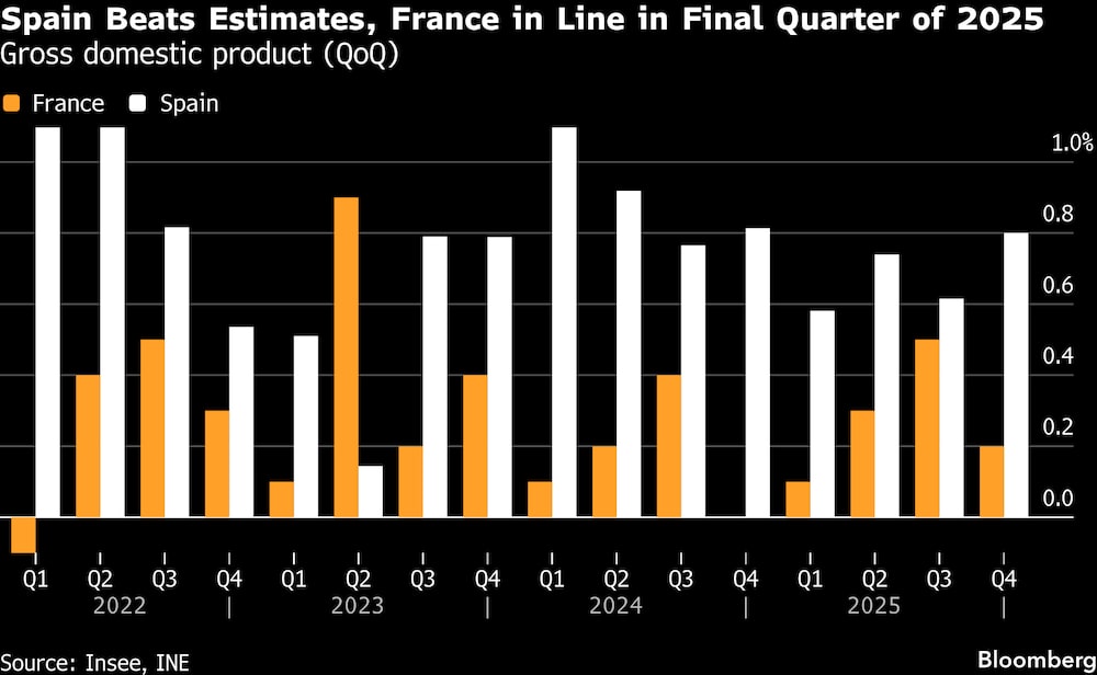 El producto interior bruto del cuarto trimestre aumentó un 0,8% en España, el más rápido en un año y por encima de la estimación mediana del 0,6% en una encuesta de Bloomberg entre analistas. En Francia, el PIB aumentó un 0,2%, más lentamente que en los tres meses anteriores pero igualando las expectativas.