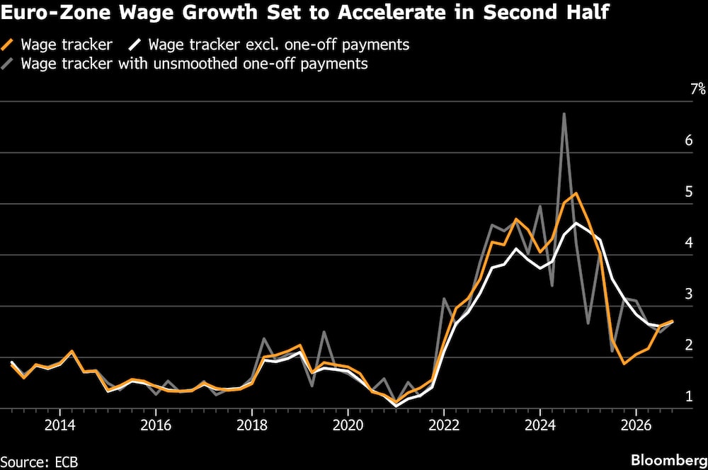 Bloomberg — El crecimiento salarial de la eurozona se acelerará en la segunda mitad del año, lo que respalda la opinión del Banco Central Europeo de que las tasas de interés pueden mantenerse estables.