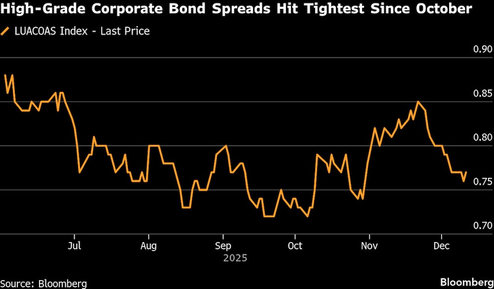 Bloomberg — El miedo se está alejando de nuevo del mercado de bonos corporativos, aunque los riesgos no lo estén. Los diferenciales de los bonos estadounidenses de alta calificación tocaron los 0,76 puntos porcentuales a principios de esta semana, sus niveles más ajustados desde octubre y cerca de su valoración más alta en décadas. Llevan estrechándose desde finales de noviembre.