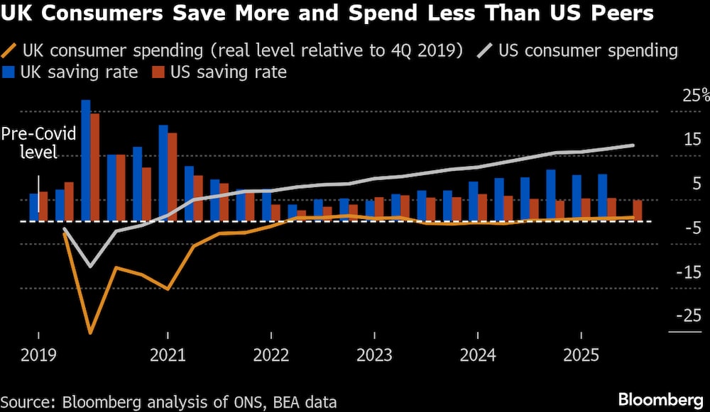 En un documento en el que examina el fuerte aumento de las tasas de ahorro desde antes de la pandemia, Michael Saunders, asesor principal de Oxford Economics, afirmó que los británicos están guardando más de sus ingresos porque no creen tener suficiente para emergencias. También influyen los tipos de interés más altos, que hacen más atractivo el ahorro.