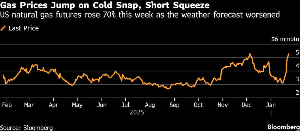 Los precios de los futuros del gas natural -combustible tanto para los hornos domésticos como para las centrales eléctricas- se dispararon un 70% en EE.UU. durante una semana de alocada negociación, a medida que empeoraban las previsiones de frío intenso. La semana anterior, los precios subieron un 30% en Europa, donde una ola de frío se combinó con el nerviosismo geopolítico para hacer subir el mercado. Antes de la repentina subida, muchos operadores de ambos lados del Atlántico apostaban por una caída de los precios.