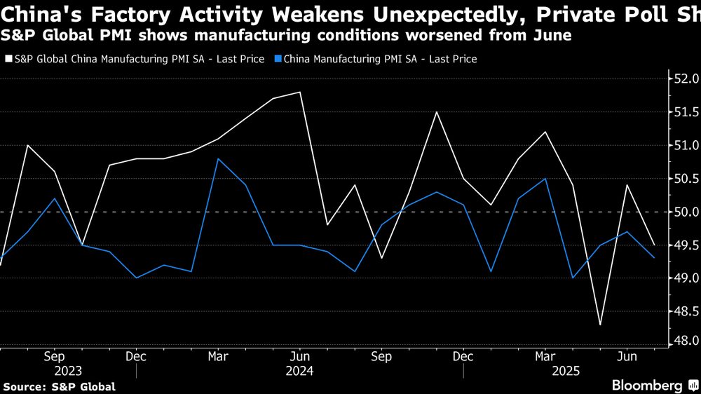 El índice de gestores de compras del sector manufacturero de S&P Global para China cayó a 49,5 desde los 50,4 de junio, según un comunicado publicado el viernes, frente a la previsión media de 50,2 de los economistas. Una lectura por encima de 50 indica expansión respecto al mes anterior.