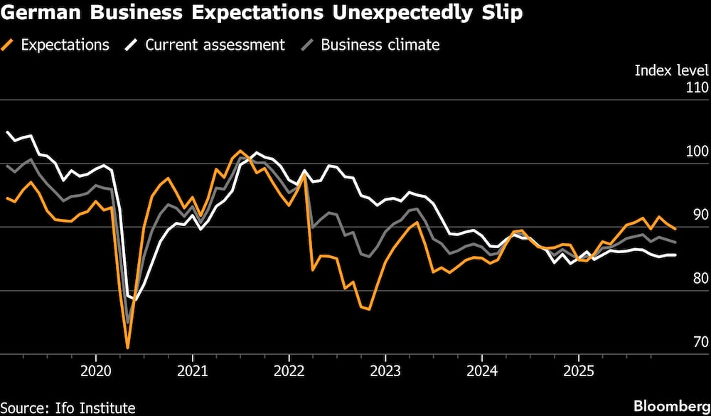 El Bundesbank predice que la economía repuntará a lo largo de 2026, y el Fondo Monetario Internacional elevó la semana pasada sus perspectivas para el año a una expansión del 1,1%. Los inversores se muestran igualmente confiados, con las expectativas en el nivel más alto desde mediados de 2021.