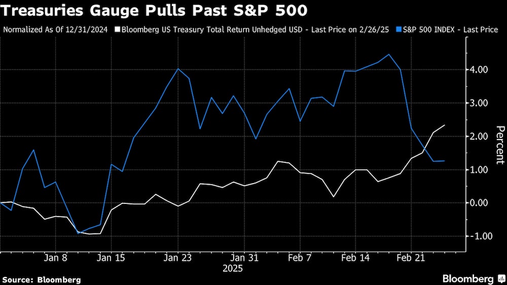 Un indicador Bloomberg de los rendimientos del Tesoro ha ganado un 2,3% en lo que va de año, superando la subida del 1,3% del índice S&P 500. La mayoría de los encuestados en el sondeo MLIV Pulse de febrero se decantaron por que los bonos del Tesoro batieran a las acciones estadounidenses durante el próximo mes.