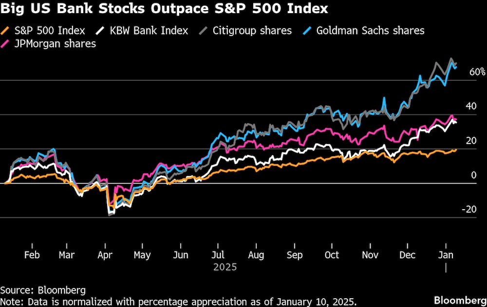 Hay pocas dudas de que los prestamistas, especialmente los seis mayores bancos de Wall Street, ofrecerán un enorme botín de beneficios, gracias al aumento de las operaciones corporativas, los fuertes ingresos comerciales y los menores costos debidos a las ganancias de productividad derivadas de la inteligencia artificial. Pero eso son en gran medida noticias viejas, y el combustible que impulsó el repunte del 29% en el índice bancario KBW -que incluye 24 prestamistas- el año pasado.