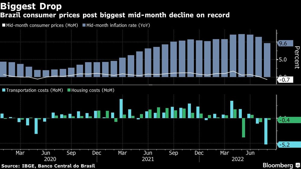 Brazil posted its biggest mid-month decline in consumer prices on record in a drop that was smaller than analysts expected, as President Jair Bolsonaro’s anti-inflation measures provide some relief ahead of elections.