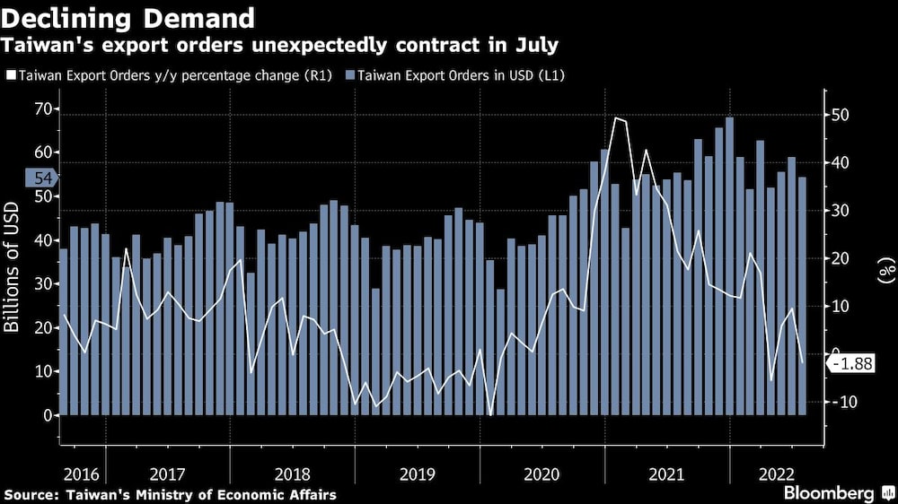 Taiwan’s export orders unexpectedly contracted in July as demand from Chinese customers plunged, and officials are now warning of further declines to come. A 22.6% decline in orders from China and Hong Kong -- which, combined, are the second-largest source of demand after the US -- was the main driver of the surprise fall, ministry data show.