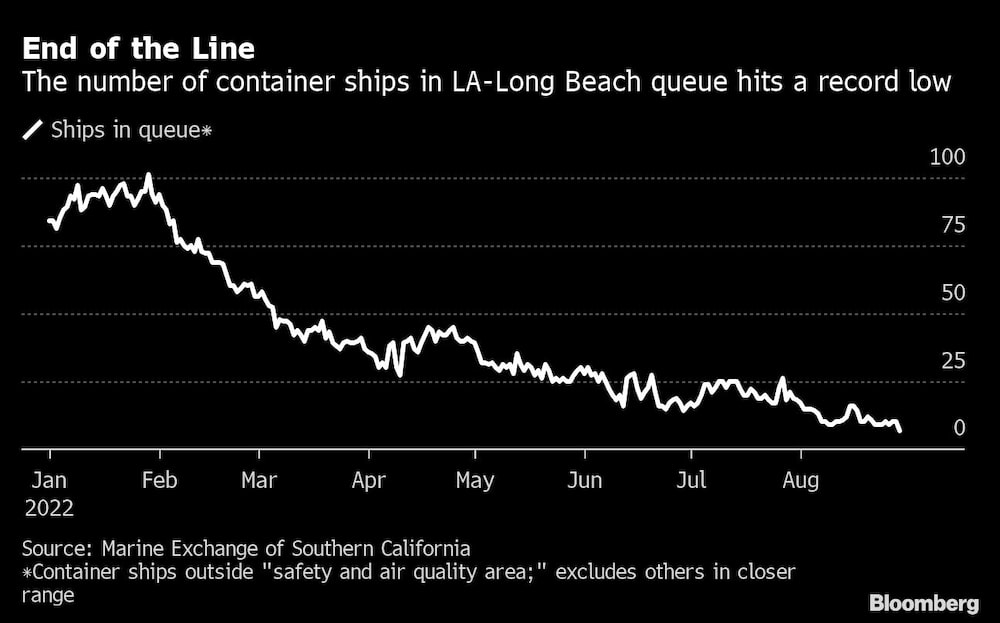 The number of container ships headed for the California ports of Los Angeles and Long Beach -- a traffic jam that once symbolized American consumer vigor during the pandemic -- declined to the lowest level since the bottleneck started to build two years ago. An all-time low eight vessels were in the official queue as of late Monday.