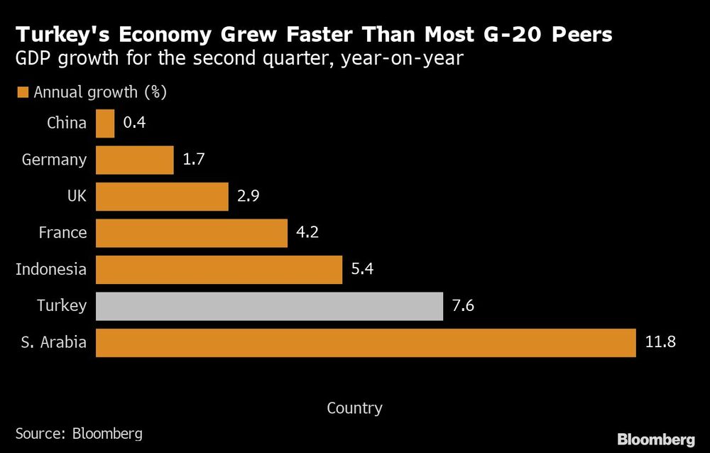 Turkey’s economy lurched forward at a faster rate than expected, as the highest inflation in 24 years prompted consumers to bring forward purchases in anticipation of steeper prices ahead.