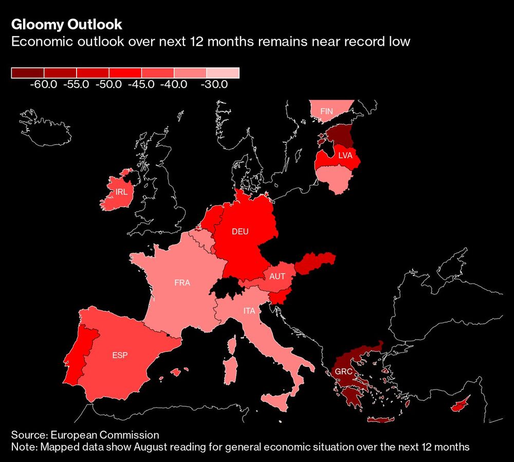 Euro-area economic confidence dropped to its lowest level in 1 1/2 years as inflation breaks record after record and limited energy supplies push the region closer to a recession. Sentiment declined in industry and services as energy shortages jeopardize output and soaring prices curb demand.