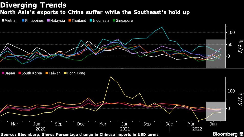 China’s economic growth slowdown has triggered a stark contrast in fortunes for its trading partners across Asia, with northern neighbors suffering while economies in the southeast are broadly holding up. The world’s No. 2 economy is still dealing with a slump in consumption and output brought on by lockdowns, compounding the hit to demand from a global semiconductor slowdown.
