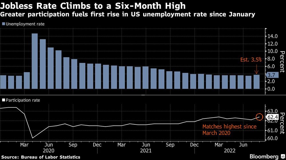 Bloomberg — The US jobless rate rose for the first time since the start of the year, inflation in Europe hit a fresh record high and China’s retail activity showed signs of stagnating because of the government’s Covid Zero policy.