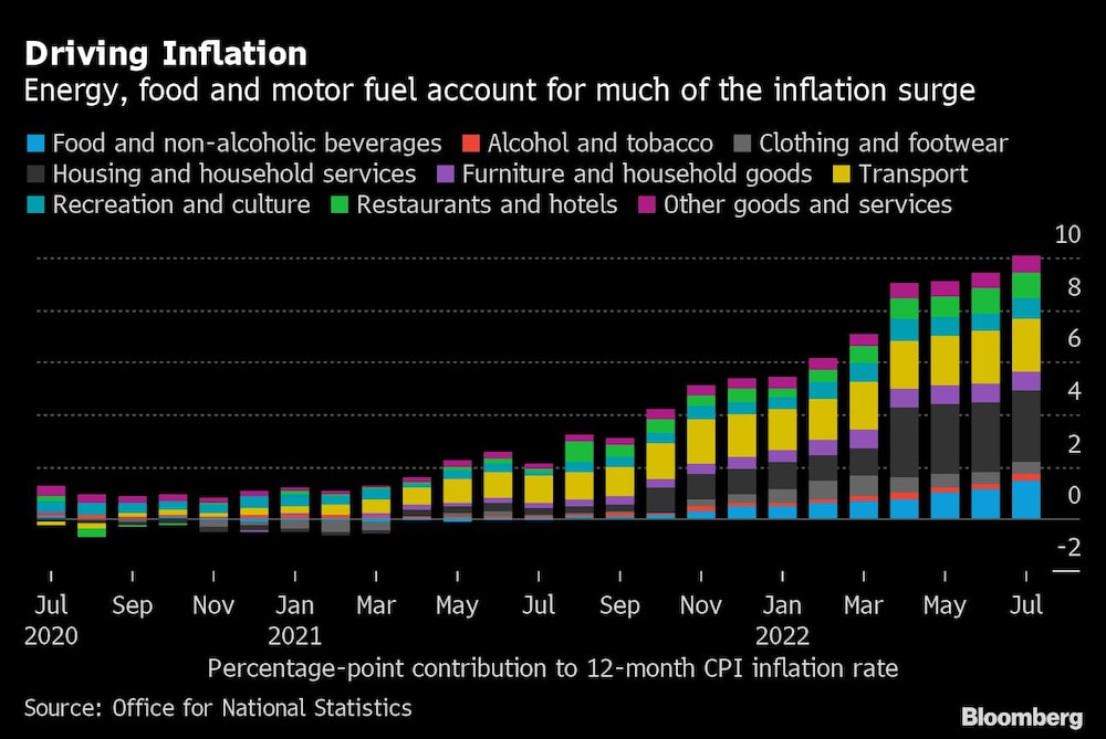 UK inflation accelerated last month to the highest in 40 years, intensifying a squeeze on consumers and adding to pressure for action from the government and Bank of England. The consumer price gauge rose 10.1% in July from a year earlier after a 9.4% gain the month before.