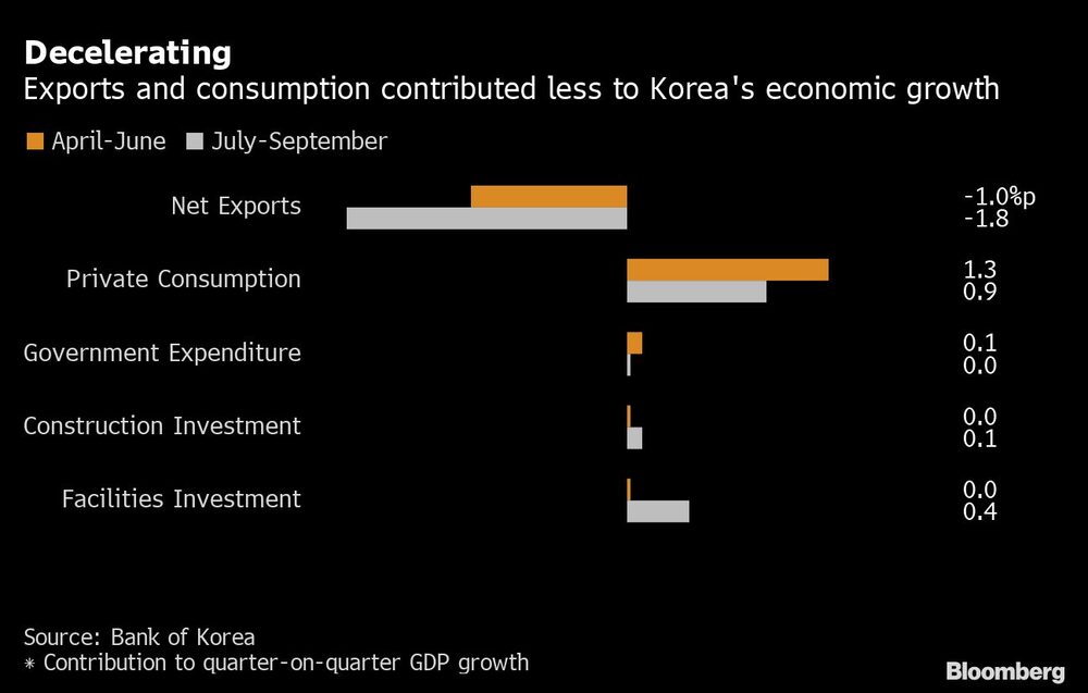 South Korea’s economic growth decelerated last quarter in response to slowing exports and a weakening currency, a result that’s unlikely to prevent the central bank from further policy tightening.