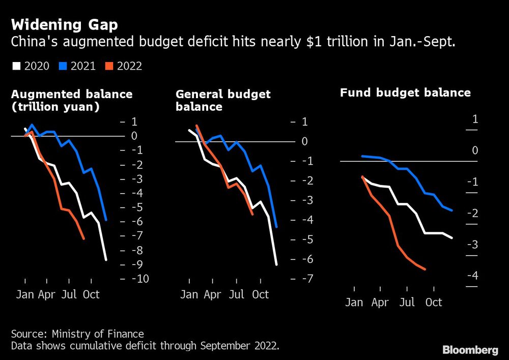 China’s broad fiscal deficit hit an all-time high in the first nine months of the year as Covid outbreaks and a housing market slump continue to erode government income. The deficit in the budgets for all levels of government was 7.16 trillion yuan ($980 billion), according to Bloomberg calculations based on data released by the Ministry of Finance on Tuesday.