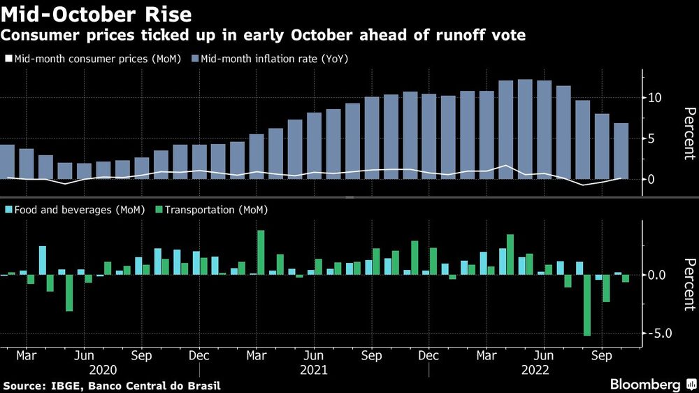 Brazil’s consumer prices rose more than expected in mid-October after declines in the previous two readings, indicating the effects from President Jair Bolsonaro’s tax cuts may be waning ahead of Sunday’s runoff vote.
