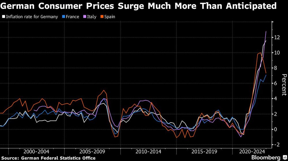 German inflation unexpectedly accelerated this month, following a trend already seen in France and Italy that will increase pressure on the ECB to raise interest rates even as a recession looms. Consumer prices in Europe’s largest economy rose 11.6% from a year earlier. Comparable rates were last recorded in the early 1950s in West Germany.