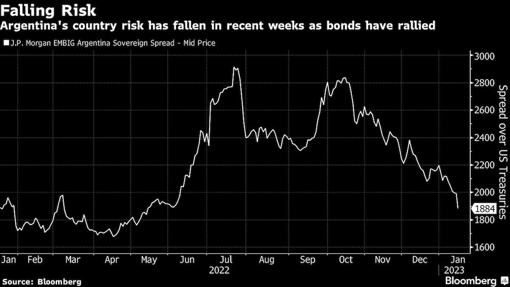 The South American nation’s $16.1 billion in overseas bonds due 2030 rose as much as 3.2 cents to more than 36 cents on the dollar, the highest since October 2021, before paring gains. It is those bonds, plus ones maturing in 2029, that the government plans to buy back, Economy Minister Sergio Massa said Wednesday, without giving details. The central bank will lead the process.