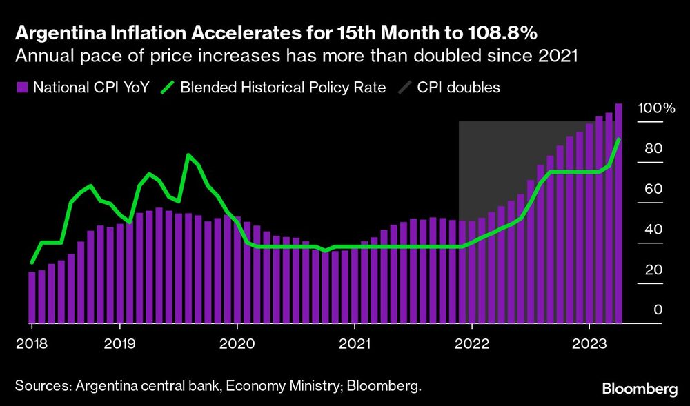 The monetary authority will raise its benchmark rate by 600 basis points to 97% on Monday while boosting intervention in the foreign exchange market, the officials said, asking not to be named before measures are formally announced by Economy Minister Sergio Massa. Policymakers are struggling to contain a selloff in the peso, which in parallel markets has lost 35% of its value against the dollar so far this year.