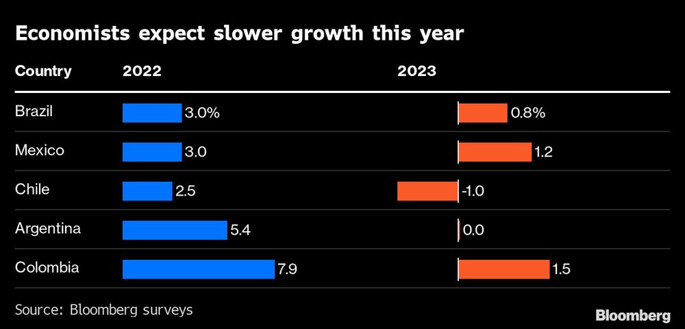 The region’s largest economy, Brazil, will expand just 0.8%, while Chile’s will contract 1%, according to the average estimate of economists in the poll. Much of the slowdown is due to increases in interest rates as central banks sought to rein in soaring inflation.