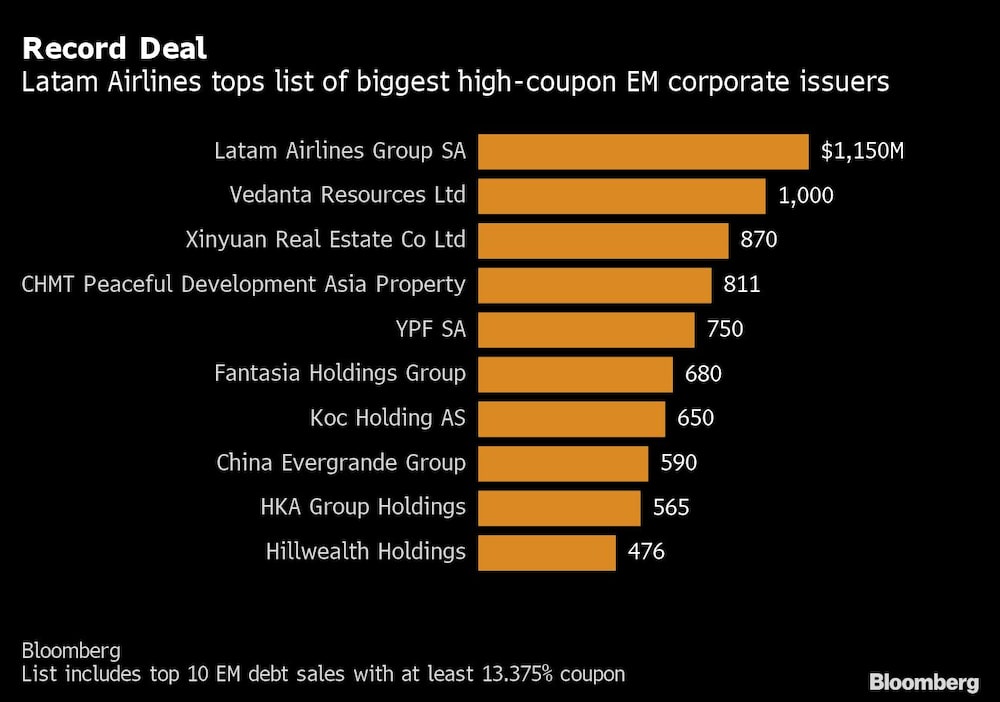 Latam Airlines Group AS (LTM) sold dollar debt last week with a coupon of 13.375%, becoming the first EM company in years to borrow more than $1 billion at such rates.