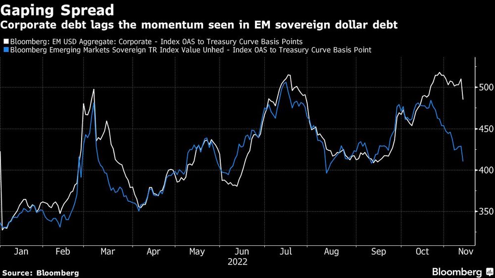 While risk premiums on corporate and sovereign EM debt were similar at the start of 2022, investors are now demanding 72 basis points more from corporate issuers, according to Bloomberg indexes.