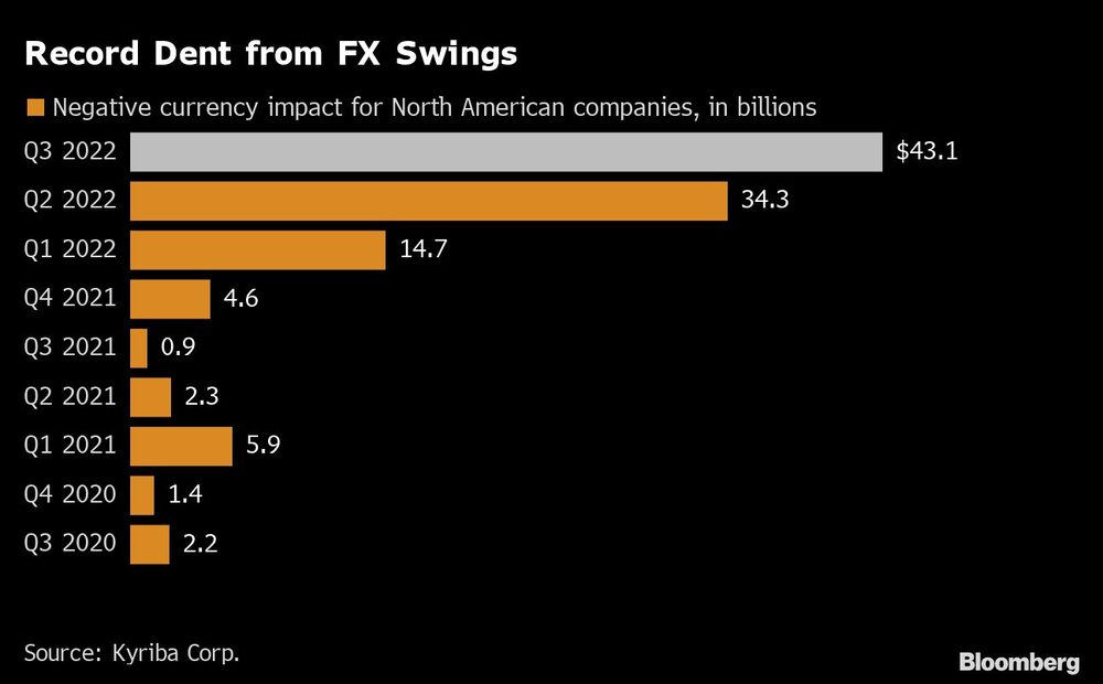 Currency oscillations cost North American companies $43.2 billion in the July to September period — an all-time high since data tracking started a decade ago — according to Kyriba Corp. That’s a 26% spike from the previous quarter, also a record, according to the corporate-treasury management software company.