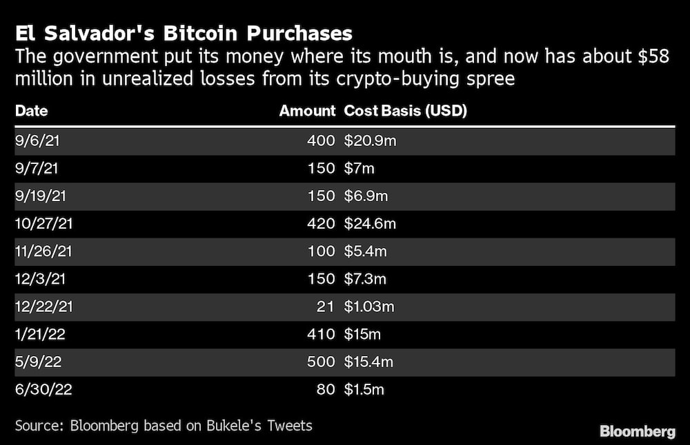 Most Salvadorans haven’t poured large amounts of money into Bitcoin, saving many from the recent bear market, Acevedo said. The same can’t be said of the government itself, which started purchasing the token last year in the run-up to its launch as legal tender and has continued to add to its stockpile, conspicuously “buying the dip” during periods when Bitcoin declined. The result? It’s sitting on losses.